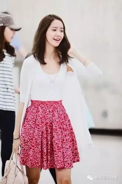 少女时代的林允儿身穿H&M背心碎花裙吹来一阵清新田园风。复古式手提包平衡了“小清新”的感觉,而稍微下滑的外套则满满都是小性感哦。