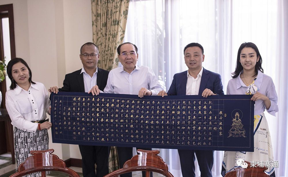 柬中文化友好协会执行会长刘海龙先生向郑源来勋爵赠送了由中国著名书法家、陕西忠武书画院院长郭大凯先生书写的《般若波罗蜜多心经》,作为中国艺术家对长期以来致力于华人教育的慈善家、教育家的郑源来会长的敬重之情。著名书法家郭大凯先生,研习唐楷,法从“二王”,其书法俊秀苍劲,并长期以来率领书法爱好者深入群众从事慈善事业,在业界享有很高的声誉。