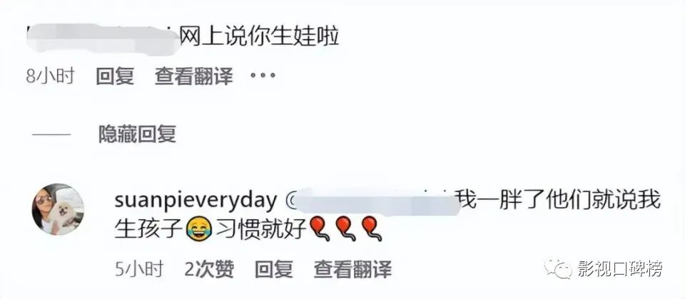 有网友在评论区里留言问:网上说你生娃啦?徐静蕾回复:我一胖了他们就说我生孩子,习惯就好。并配上3个放飞气球的表情。