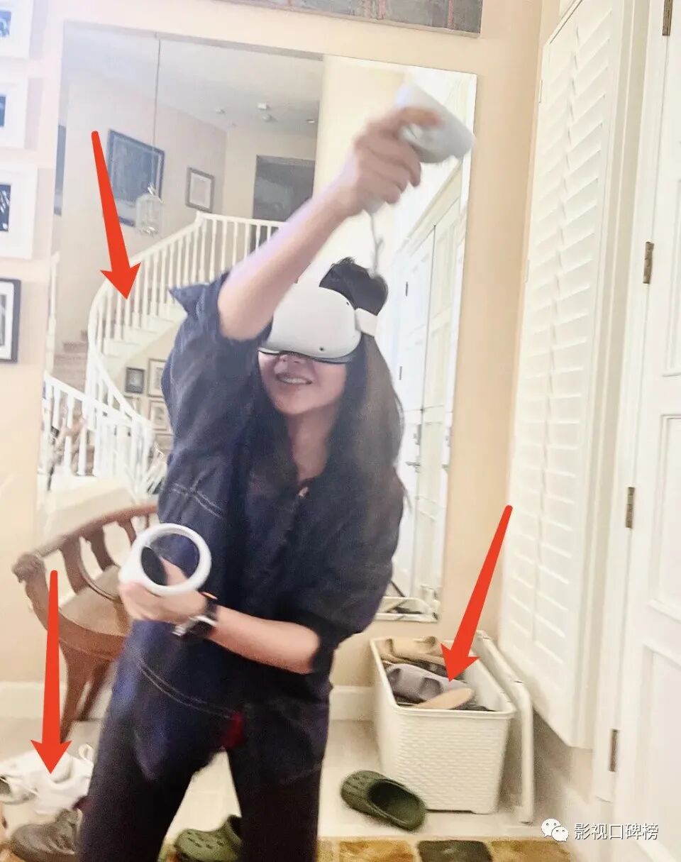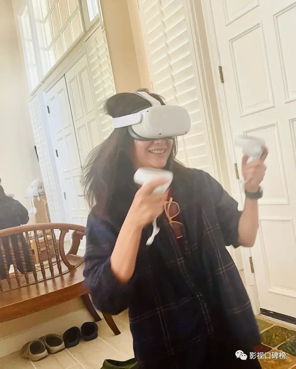 徐静蕾穿着长袖格子衬衫下搭黑色紧身瑜伽裤,虽然她戴着VR眼镜只露出的半张脸,看上去脸部有肉、有双下巴。徐静蕾为了玩游戏形象也不顾了,头发显得有点乱,脸上几乎没有化妆。一看就知道,她处于痴迷的状态。