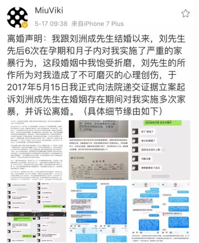 早在2017年5月,刘洲成的前妻以家暴为由向法院提出了离婚诉讼,并在微博曝光