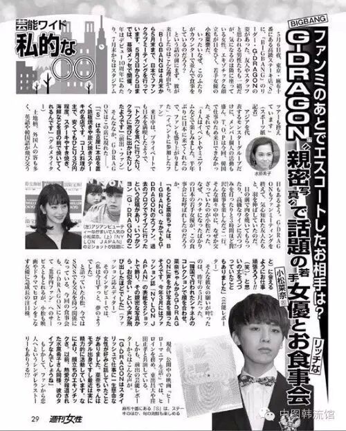 日本媒体《週刊女性》5月17日报导BIGBANG的G-Dragon在结束BIGBANG东京粉丝见面会后,前往餐厅与模特儿小松菜奈碰面,进而传出两人正在交往的消息。