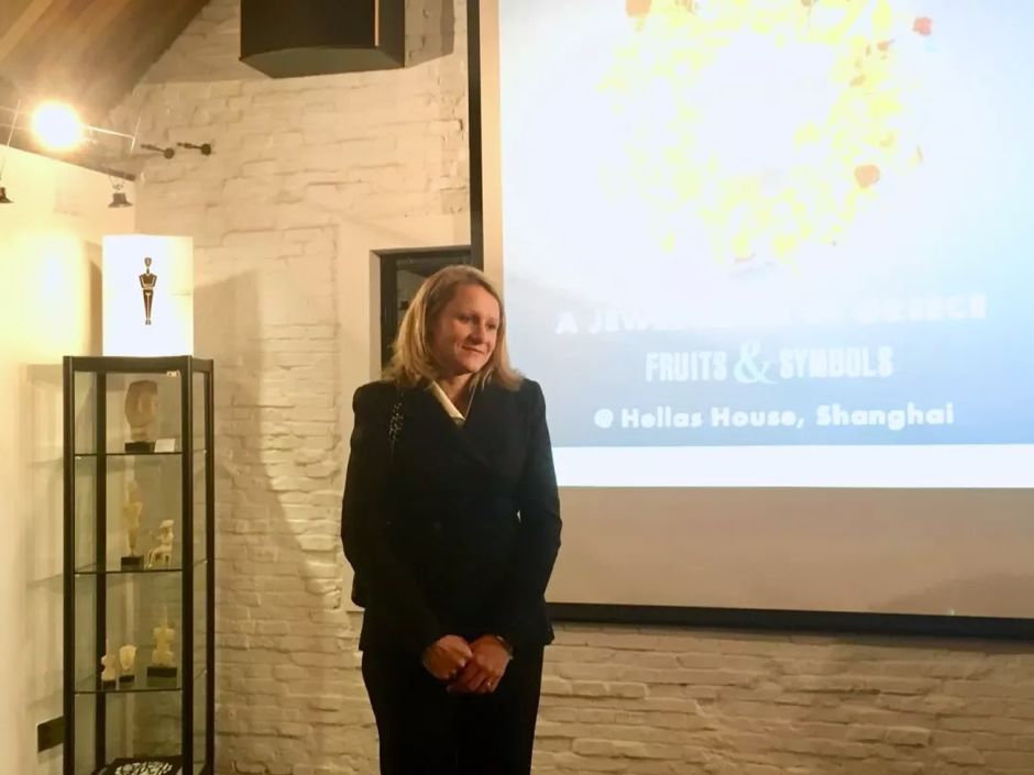 Mrs. Emilie Marinova, the spouse of the Consul General of Greece in Shanghai during her speech.
