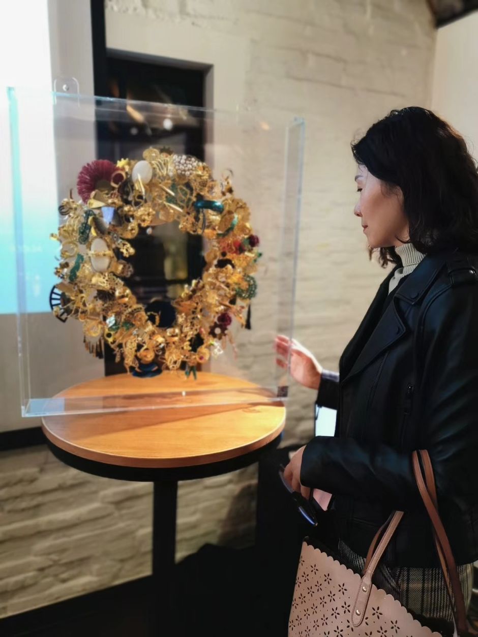 A guest admires the Wreath 2019 by Mary Samoli, the founder of the AJMIG platform.