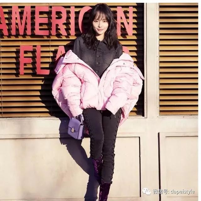 最近很火的CHENPENG羽绒服,张嘉倪也没错过,用来内搭牛仔夹克+侧绑带牛仔裤,时髦又不失性感,脚上的丝绒短靴实力抢镜,跟上衣颜色相符相称,视觉上统一且不凌乱。