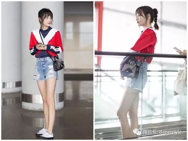 俗话说自古红蓝出cp,红色与蓝色搭配在一起总有一种不言而喻的高级感,张嘉倪这一身就正是如此,红蓝拼接上衣搭配浅色牛仔短裤,低调不失高级。