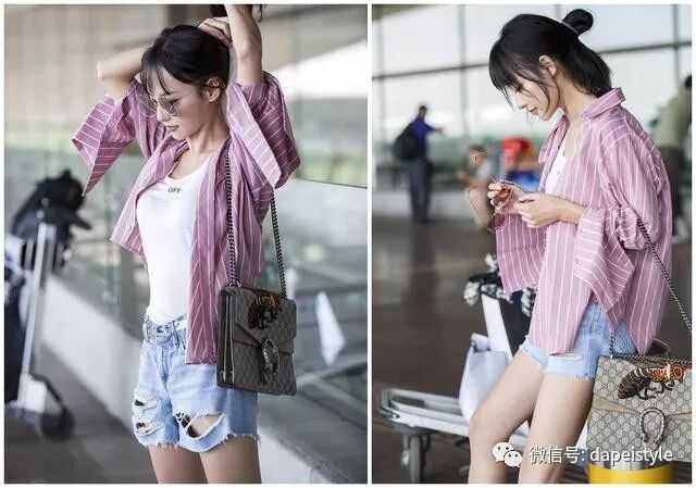 粉色是2017年夏天比较火的颜色,内搭极简白T下穿破洞牛仔短裤,十分清新少女,另外粉色条纹衬衫的宽大袖口设计也是相当抢眼。