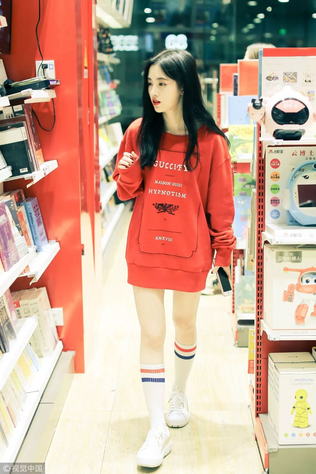 ▲运动风的红色卫衣同样是“下衣失踪式”穿法,配上长运动袜与运动鞋只能看到满屏的小细腿了~增高效果立显。
