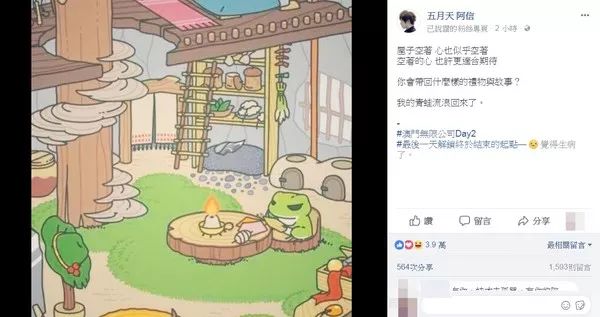 《旅行青蛙》不仅风靡两岸,就连娱乐圈中,也有不少艺人也沉浸在疗愈画风里头。阿信27日透过粉丝专页发文,PO出该款游戏的截图,感性写道,“屋子空着,心也似乎空着,空着的心,也许更适合期待,你会带回什么样的礼物与故事?我的青蛙流浪回来了。”不过,目前人在澳门举行演唱会的他,却在文中标注,“觉得生病了。”令不少歌迷纷纷留言关心他的健康状况、希望偶像能注意身体。