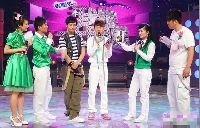 这一张是郭敬明上《快乐大本营》和何炅站在一起的照片。