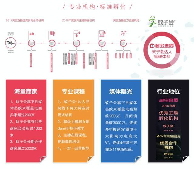过去近两年时间里,蚊子会达人学院总共进行了15场主播培训,增删修改课件15次,3000张淘宝直播内训PPT,培养了800多位淘宝主播,她们如今活跃在今天的淘宝直播平台,收获着荣耀和财富。