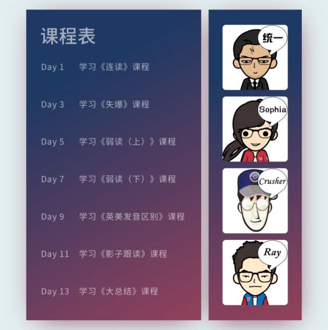 终于,经过了几个月的打磨和无数轮的迭代后,我带领团队生产出了7节发音技巧课,在14天的时间内,全部教给你。
