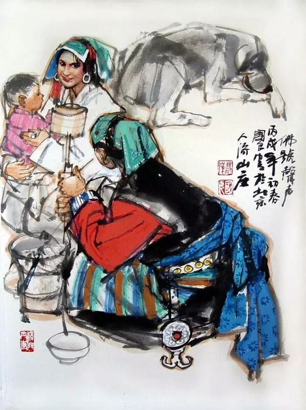 禅宗有见山是山、见山不是山,见山还是山种种不同境界之说。我们可以说,史国良出家后切身的宗教体验会使他以一种全新的眼光重新审视观照出家前就熟悉的他的艺术所表现的世界,这使他的作品多了一缕祥和朴实的宁静之气,其他世间人描绘宗教题材的作品多描绘宗教的苦难,而史国良的作品反映出了宗教对人的精神的解脱,这大概和他出家以后的心境有密切的关系。同时史国良又自称是一个入世的和尚,这是与过去的画僧不一样的地方,过去的画僧如八大、石涛、弘仁、髡残、虚谷等大多是画山水和花鸟的,较多地关注自己的内心,而史国良却仍然关注着人世,关注着普通人的生活,这是一种高高山顶立,深深海底行的存在方式,作为中国画僧的当代传人,他以石涛的以笔墨为佛事自励,以出世的精神做着入世的事业。 史国良的绘画被称为中国当代写实人物画的重镇,也被称为徐蒋体系(徐悲鸿——蒋兆和体系)的第三代传人。徐蒋体系是用两方古典学院派的写实技巧来改造中国传统文人写意画尝试的一种体系,也就是用西方的素描速写技法来画中国画,在一定意义上也是用中国的书画工具来进行素描和速写。这种艺术形式也是五四以后中西艺术交流的一个结果。史国良的绘画写实性来源于他的写生基础,他受过严格的素描速写等写生训练,也曾多次到西藏去体验生活和写生。史国良的写实风格也是与他的两位老师的影响分不开的,一是周思聪,一是黄胄。周思聪是蒋兆和的学生,并且都受过苏俄体系的素描训练,造型基础扎实,我们可以从史国良的《大昭寺》《礼佛图》中看到蒋兆和《流民图》对他的人物造型和写实风格的影响,也可看出他们之间的传承关系。黄胄是由速写进入中国画坛的,并且以新疆人物速写闻名于中国人物画坛,而史国良以西藏人物画闻名画坛,他的反映藏民宗教的作品《刻经》荣获第23届蒙特卡罗国际艺术大奖赛“联合国科教文组织大奖”,这也是绘画界的“奥斯卡奖”,我们可以从史国良的诸多作品中看到线对人物造型的影响,这显然是与黄胄对他的速写训练分不开的。