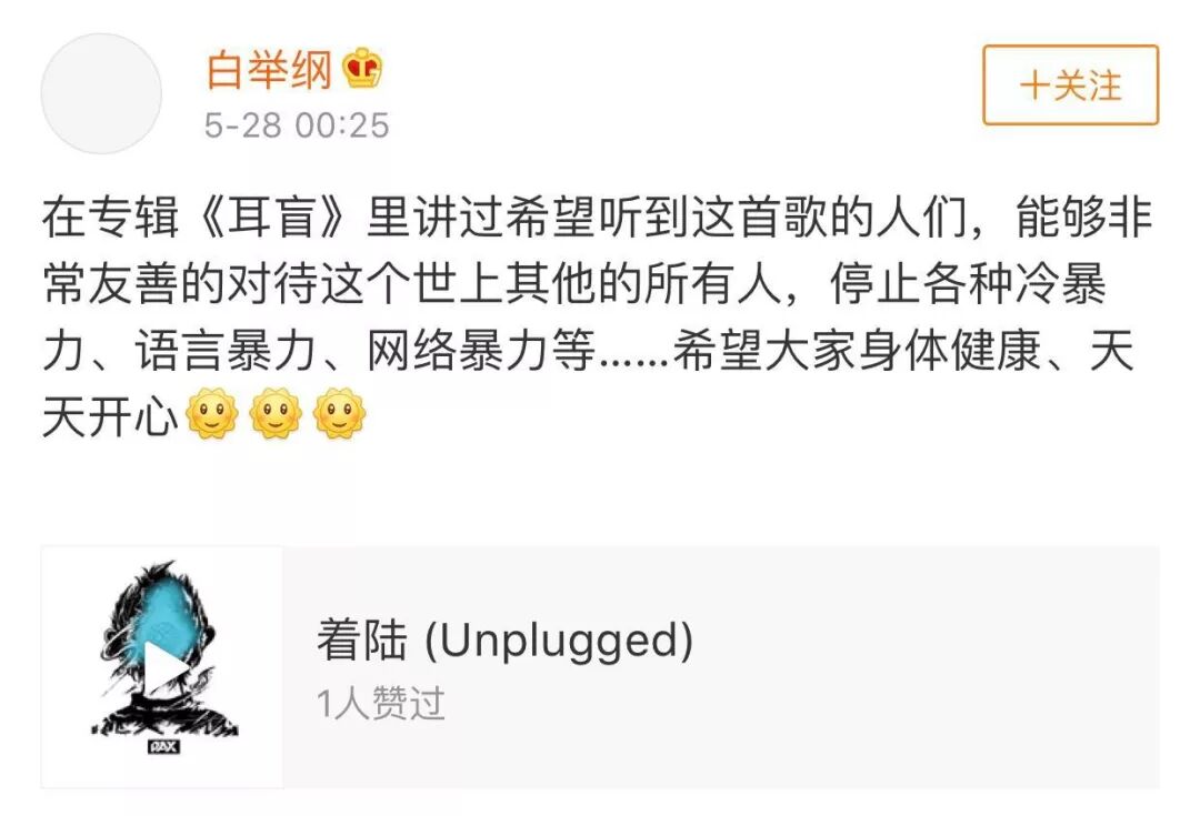 而今天零点,白举纲上线了一首新歌,是他去年《耳盲》专辑中《着陆》的不插电版。