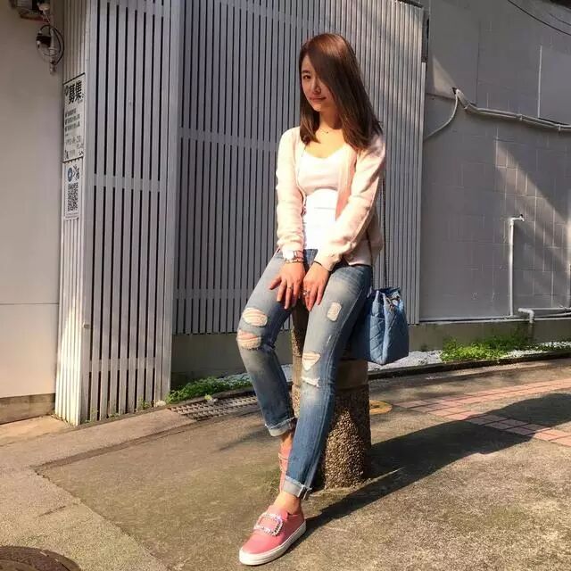 粉色开衫内搭白色T恤,下搭破洞牛仔裤,脚踩粉色懒人鞋,很粉嫩减龄哦。
