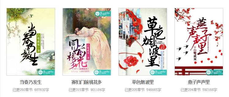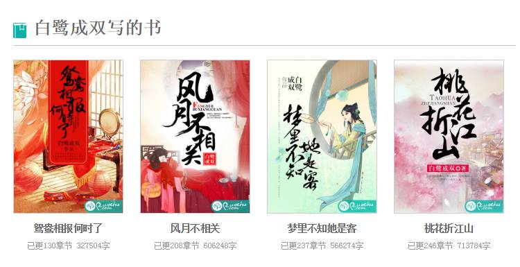 白鹭成双,若初文学网大神级作家,《宅中歌》《凰歌千秋》《凰歌潋滟》等作品已繁体出版,笔名:蒹葭苍苍。《春闺梦里人》由魅丽文化策划出版,已上市,影视版权已售出,正在改编剧本中;《寡妇门前桃花多》居于若初网各大榜首,并签约魅丽文化策划简体出版。《当春乃发生》已签约出版。网站正在连载的作品《桃花折江山》居于若初网各大榜单。