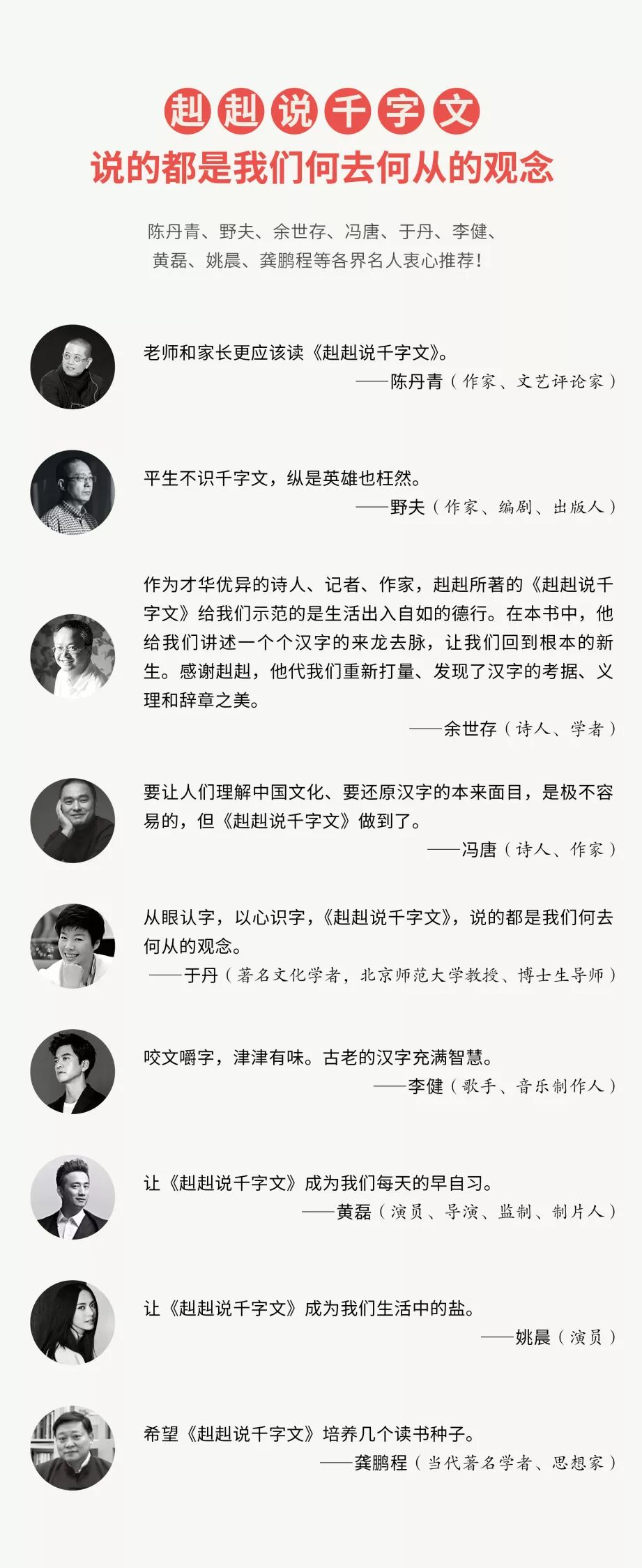 著名作家陈丹青、野夫、冯唐,著名学者余世存、于丹、龚鹏程,明星李健、黄磊、姚晨、叶蓓,媒体人邓康延、詹正凯、程益中,真格基金创始人徐小平,艺术家徐冰、尚扬,中国领军公众号十点读书,青年学者akasode,烹饪大师大董等十余位知名大咖联袂推荐:识字如识人,要识就识那些受益一生的字。