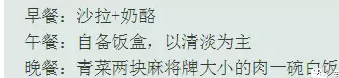 说她的减肥主要是靠节食,看看菜谱,估计让我坚持一天我都受不了,怎么能吃得下去!除此外还有高强度运动+减肥澡