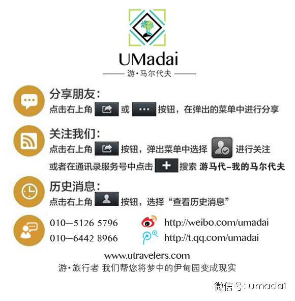 马尔代夫中国区特别合作代理(umadai.com)发布马尔代夫岛屿资讯和特价优惠信息,提供专业的马尔代夫岛屿咨询、选岛以及岛屿酒店和机票预订,定期和岛屿举行官方主题活动。无论什么时间,不管您渴望什么,我们都会全力配合,以满足您的每一个愿望!