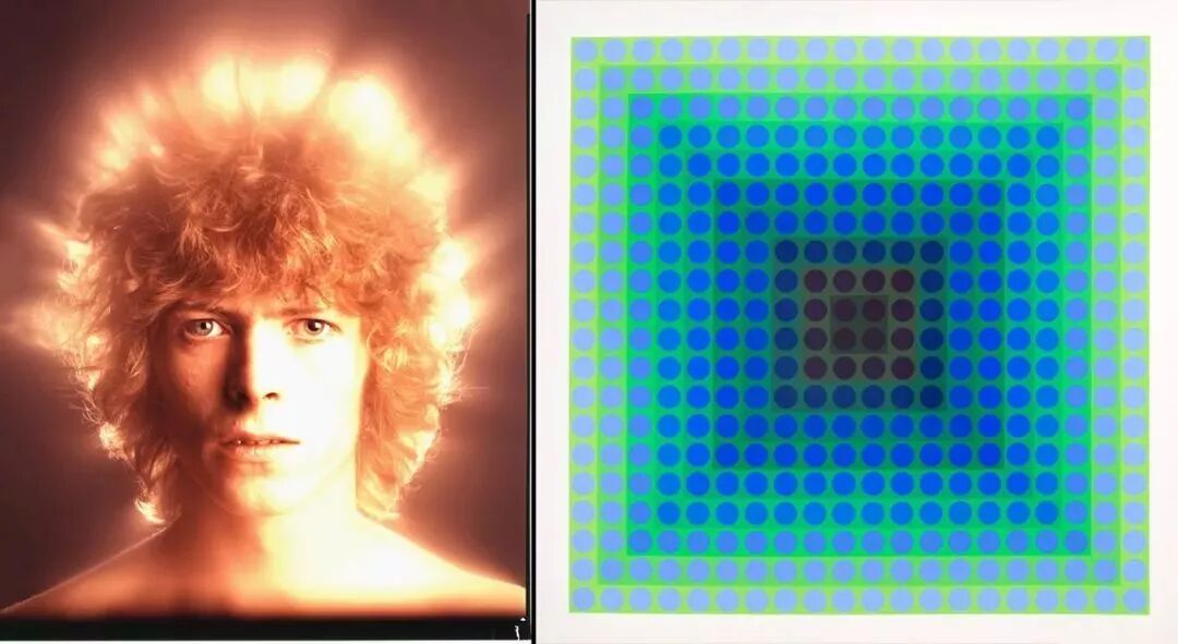 封面上,David用了自己的头像照片,重叠在一张欧普风格的照片上。欧普艺术又被称为光效应艺术,艺术家利用线条、形状和色彩的周期组合,来引起观赏者的视觉错位,这种艺术风格在当时常被应用在时装设计中。