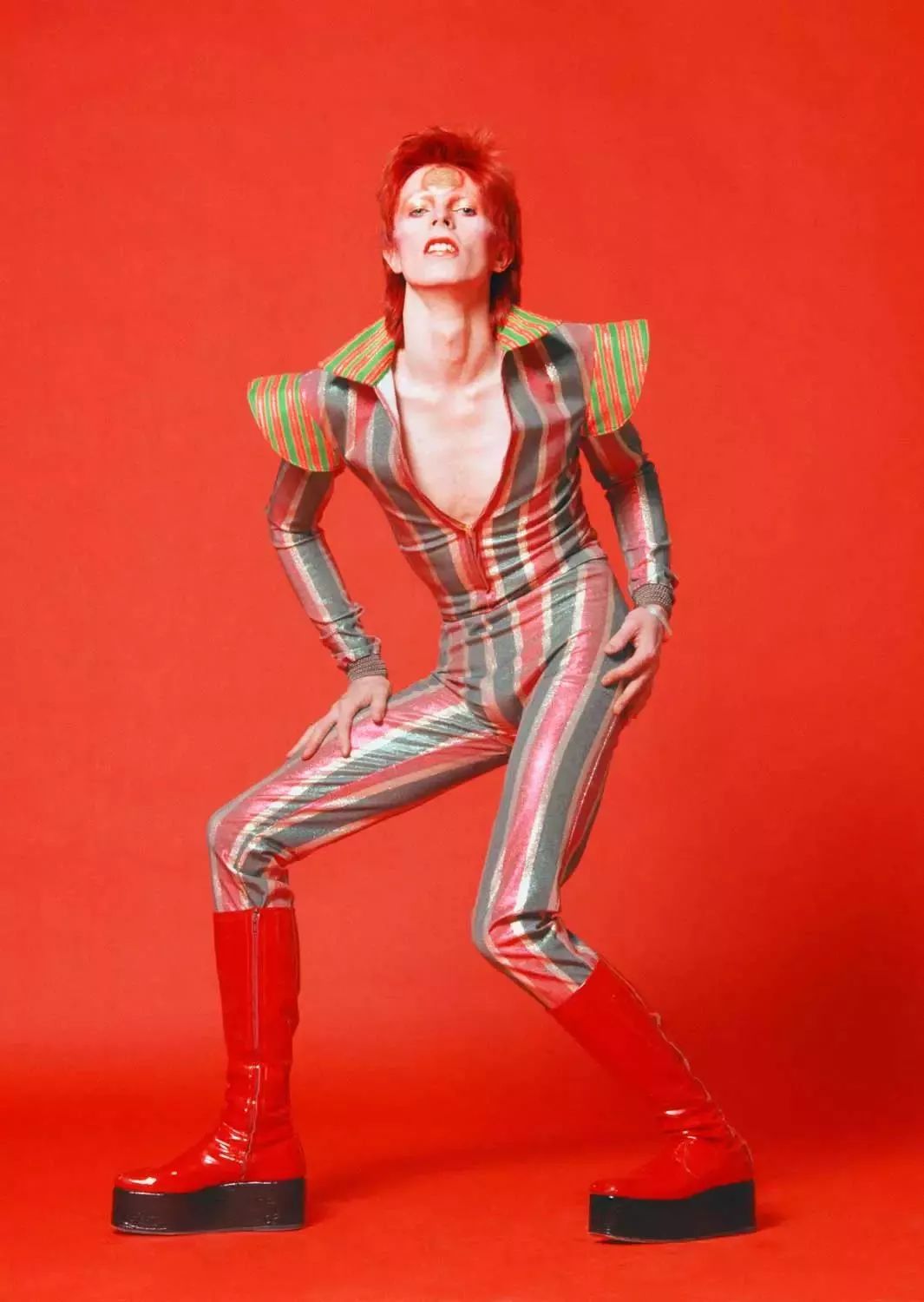 艺术和情绪让人孤独而极致,25岁的时候,David创造了自己的第二个角色——Ziggy Stardust,他穿着色彩鲜艳的连体裤,顶着一头火红的头发,穿一双漆皮靴,画着风格诡异的妆容,像一个来自异世界的雌雄同体的怪物。