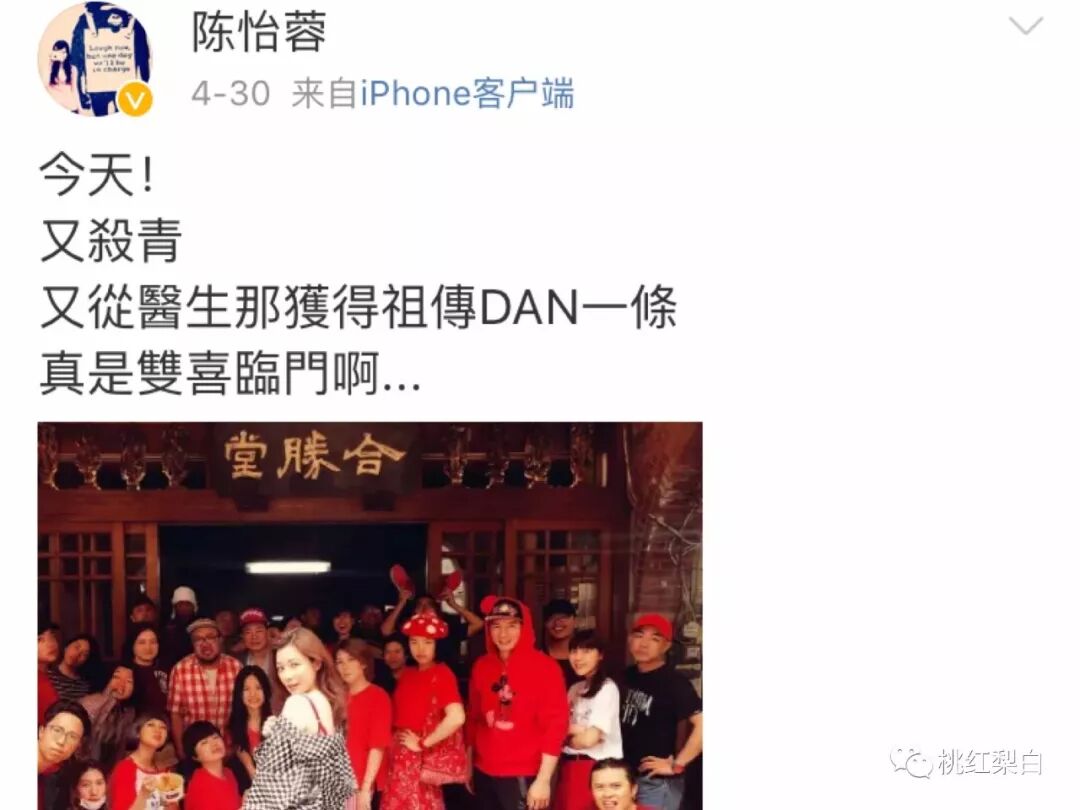 早在今年四月,陈怡蓉就在微博上喊话“获得祖传DNA”,公布怀孕已久的喜讯。