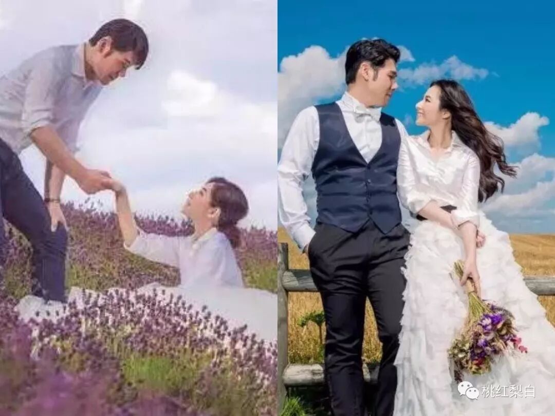 婚纱照也非常应景的,选在了一片薰衣草花田里拍摄。