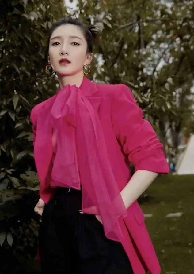 这组造型中江疏影则凸显出了她的大女人气息。她选择的是非常难挑战的枚红色look,内搭她选择的是一件玫红色的衬衫,领口部分的薄纱蝴蝶结装饰给整个穿搭注入了浓浓的女人味,外面穿的是同色系的玫红色西装,将她的身材比例很好地修饰出来,下装简单的搭配了一条黑色西装裤,因为上面已经比较鲜艳了,所以下装搭配黑色的裤子可以更加协调一些。这一天江疏影将头发扎起来高丸子头露出精美的五官,配上精致的妆容以及大红唇,整个人站在那里就散发着女明星气场。