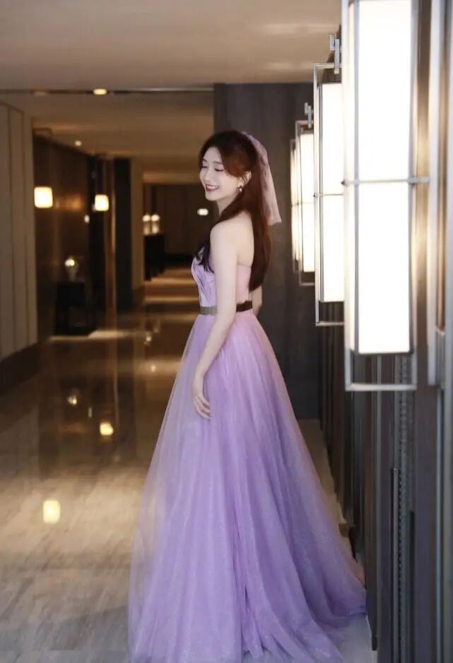 这一套搭配中江疏影选择的是一件紫色的礼服裙,紫色是今年大火的流行色,可以很好的凸显出浪漫优雅的女人味,抹胸的款式很好的凸显出了脖颈线条,将江疏影的天鹅颈凸显出来,浪漫的紫色薄纱设计,可以很好的将她雪白的肌肤衬托的完美,这一天江疏影搭配的发型是半马尾,这种发型非常适合打造公主风气息,妆发设计方面,精致干净的底妆凸显出自然好皮肤。一抹大红唇给整个穿搭注入亮点。