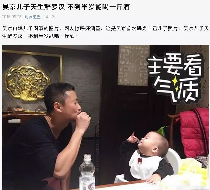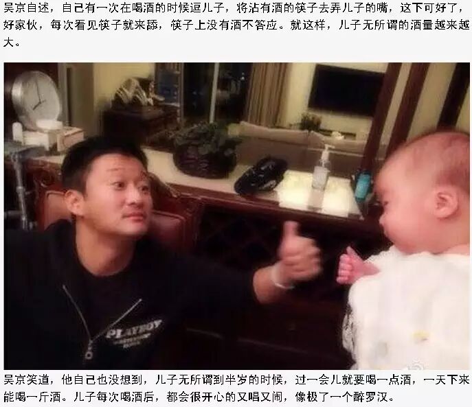 文称:这是吴京首次曝光自己儿子照片。吴京儿子天生醉罗汉,不到半岁能喝一斤酒!......吴京自述,自己有一次在喝酒的时候逗儿子,将沾有酒的筷子去弄儿子的嘴,这下可好了,好家伙,每次看见筷子就来舔,筷子上没有酒不答应。就这样,儿子无所谓的酒量越来越大。吴京笑道,他自己也没想到,儿子无所谓到半岁的时候,过一会儿就要喝一点酒,一天下来能喝一斤酒。儿子每次喝酒后,都会很开心的又唱又闹,像极了一个醉罗汉。