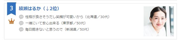排名第一的不出所料,是“大家的老婆”新垣结衣。