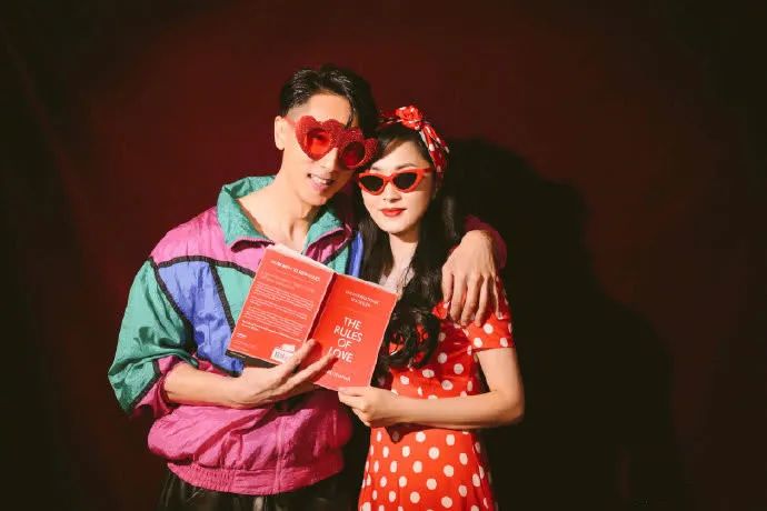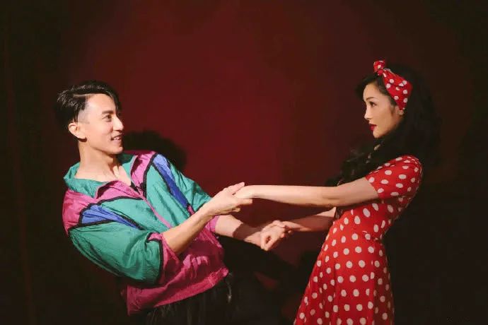 复古俏皮风中,吴尊穿着五颜六色的上衣,林丽吟则换上了复古波点连衣裙,夫妻俩手拉手深情对视,画面甜齁。