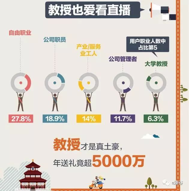 土豪职业也不尽相同,大数据报告显示,自由职业、公司职员、产业/服务工人、公司高管名列前四名,大学教授以年度打赏金额超5000万惊现土豪榜。