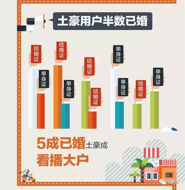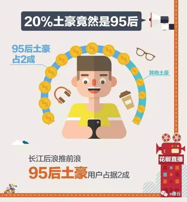 而据花椒直播从用户行为分析看,22点是土豪一天当中最冲动、最活跃时间,主播们可有针对性的选择直播时间,来与“专属土豪”邂逅。而土豪最钟爱的打赏是价值2000元人民币的“蓝色妖姬”。 而土豪用户中半数已婚,20%的土豪是95后。