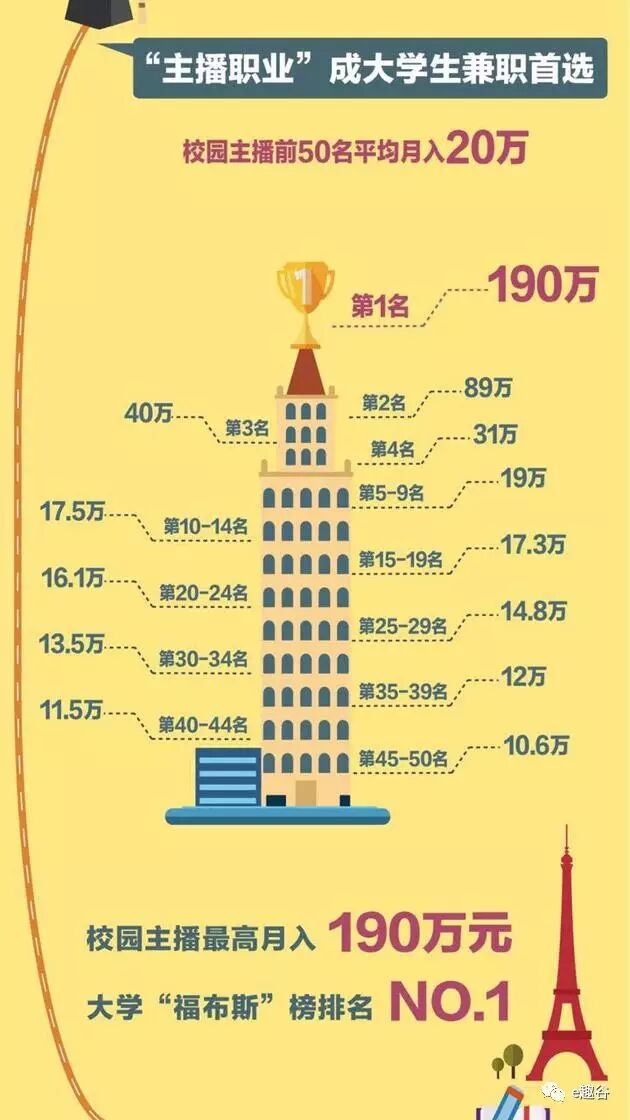 直播不仅成了大众社交、娱乐的聚集地,花椒直播也是首个推出校园频道的平台。很多大学生都在花椒直播找到了自己的一席之地。大数据发现,校园主播月收入最高可达190万,而前五十名的平均月收入也在20万元左右,远超一般上班族。