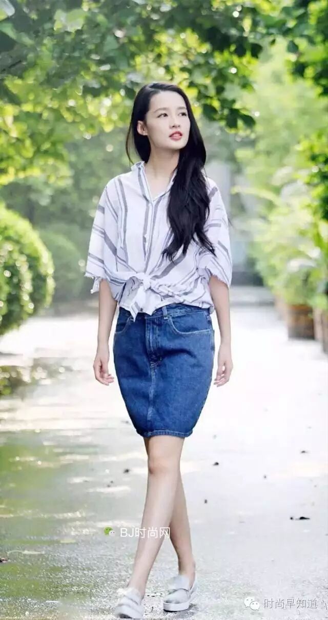 不规则衬衫搭配牛仔包臀半裙脚踩懒人鞋,简单的搭配却不简约