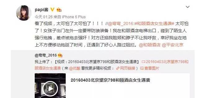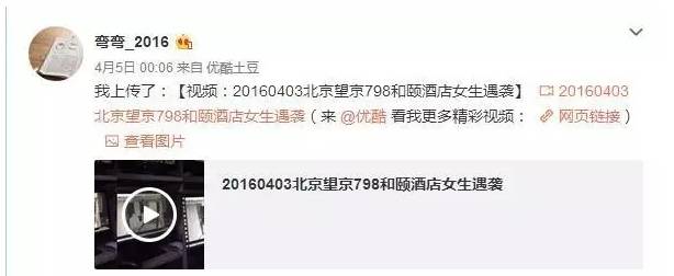 “弯弯_2016”于4月5日00:06在微博里上传了一段自己在北京颐和酒店遭陌生男子强行拖拽离开的视频,陌生男子对弯弯使用了掐脖子、扯头发等暴力行为,但旁边的酒店工作人员却没有明显的出手制止。最后是一位路过的女房客及时拉回弯弯,才让弯弯得救!