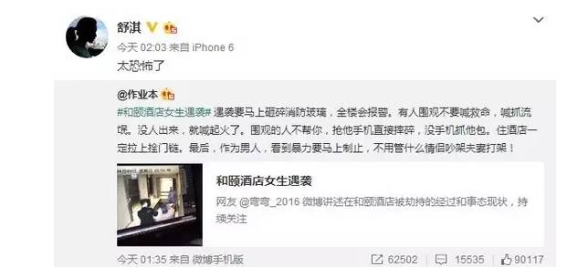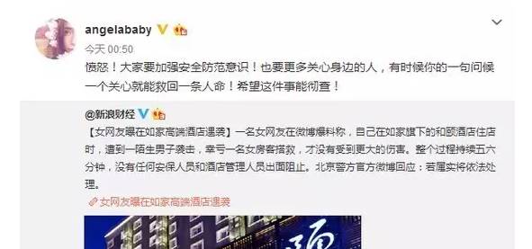 由于涉及“女性安全”这个敏感话题,再加上事发时酒店工作人员不作为,事发后酒店方及警方不积极处理(弯弯所述),令事件在微博上持续发酵,众多微博大号及明星纷纷转发微博并表示强烈谴责!