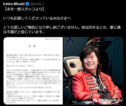 讣告 | 『动画歌曲帝王陨落!』著名歌手作曲作词家「水木一郎」因病过世! AEMedia高达主题论坛 日韩男星 2022-12-13 23:20:07 538 创作不易,用心坚持,欢迎请BaGua喝几杯爱心咖啡!打赏并支持本文 打赏并删除本文 ↑同好进群、客服问题、欢迎调戏↑▍日本著名动画歌手、作词家、作曲家、声优「水木一郎」老师的官方推特在2022年12月13日发布讣告,「水木一郎」老师已于2022年12月06日因癌症并发症去世,享年74岁。「水木一郎」老师有着动画歌曲界的帝王称号,被粉丝亲切地称呼为「兄贵(ANIKI)」。从上世纪70年代开始就演唱许多的动画、特摄片主题曲与插入曲,其中就包括在中国也为人熟知的『魔神Z』『假面骑士X』『超电磁侠孔巴图拉V』『超级机器人大战』等等。进入新世纪频繁举办古早动画歌曲音乐会而广受欢迎,是动画界家喻户晓的知名歌手 ๐·°(৹˃̵﹏˂̵৹)°·๐「水木一郎」官方推特发布的讣告 创作不易,用心坚持,欢迎请BaGua喝几杯爱心咖啡!打赏并支持本文 打赏并删除本文 感谢您的支持鼓励,我会继续努力的!文章地址:用户邮箱:打赏金额:USDT 请输入数字点击”去打赏“,即可进行打赏支持本文章哦 水木一郎 About the Author AEMedia高达主题论坛 功能介绍:为全球华人提供丰富多彩的高达世界 (Colorful Gundam World for Chinese all over the World.) Related Posts 讣告 | 『动画歌曲帝王陨落!』著名歌手作曲作词家「水木一郎」因病过世! 2022-12-13 23:20:07 推广 | 全球最大最专业手办展Wonder Festival 2018年4月登陆上海! 2017-09-15 00:02:36 音乐 MISIA献唱高达系列第一作『高达铁血孤儿』ED曲『... 2015-12-03 22:18:15 发表评论