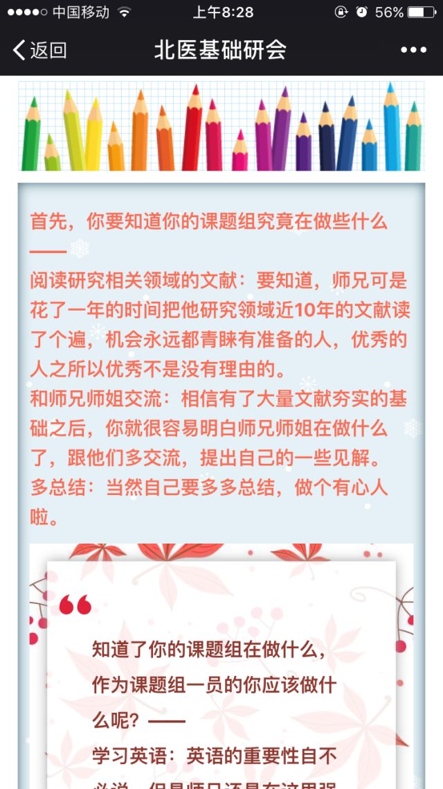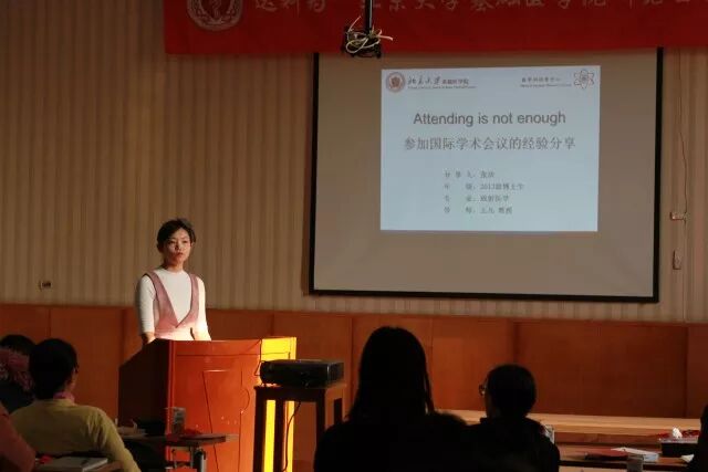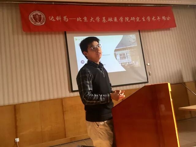 例如王麟同学花了一年的时间把某研究领域近10年的文献通读一遍,目前以第一作者发表8篇SCI文章。除了分享科研经历外,王麟同学还劝诫同学们,来到课题组首先要知道你的课题组究竟在做些什么,在实验呆的时间短则三年,长则五年甚至更多,这是一段漫长的时间,除了做好实验外,还要注重与导师同学的交流。同时作为北京大学第十三次代表大会中来自医学部的唯一一位学生身份的党代表,他还传达了北京大学第十三次党代会的精神,希望北大人都不忘初心。他引用李大钊同志的一句话作为结语,“只有学术上的发展值得作大学的纪念,只有学术上的建树,值得北大万万岁的欢呼”,希与诸君共勉,愿矢志科研的同学都能在学术上有所建树。