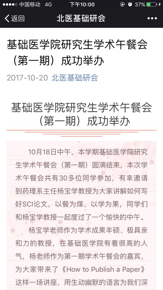 目前,基础医学院已经组织了两期学术午餐会活动,在广大研究生同学中引起强烈反响。第一期活动,基础医学院邀请到药理系主任杨宝学教授为大家讲解如何写好SCI论文。杨宝学老师作为学术成果丰硕、极具亲和力的教授,在基础医学院有着很高的人气。作为第一期学术午餐会的嘉宾,杨老师为大家带来了How to publish a paper讲座,用生动幽默的语言深入浅出的介绍了如何写好一篇SCI论文。讲座内容干货满满,参加午餐会的同学纷纷表示大快朵颐。