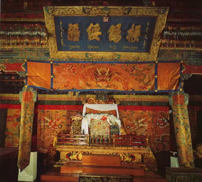 宝座上方有1867年同治皇帝所赐的“振锡绥疆”金字匾文。