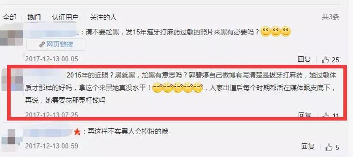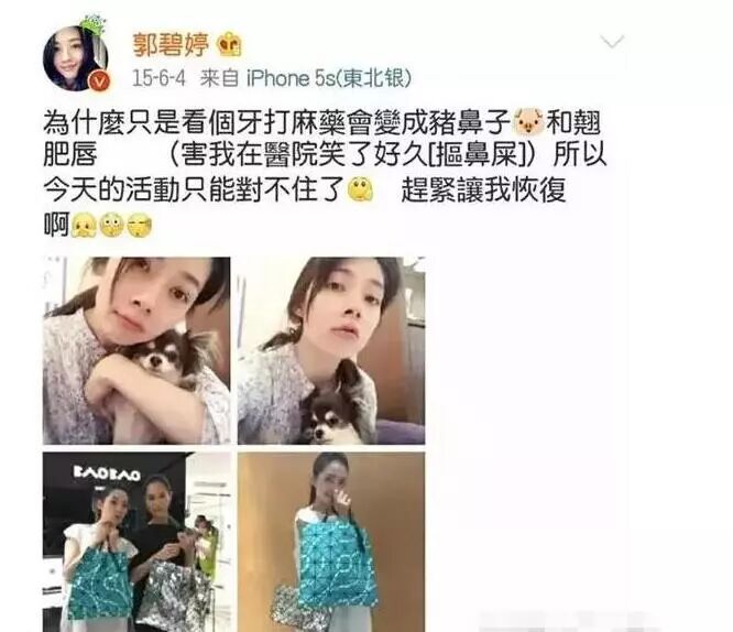 有时候还真的佩服粉丝的记忆力和搜查能力,那么久以前的事情都还记得,去郭碧婷的微博翻一圈,果然郭碧婷几年前就出来澄清过了,确实是打麻药导致的。