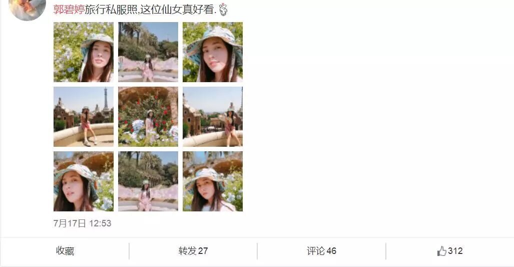 不拍戏的郭碧婷应该是去旅游了,最近网上就有一组郭碧婷的旅游私服照被曝光。粉丝们都说郭碧婷美得像天仙,私服照都好好看。