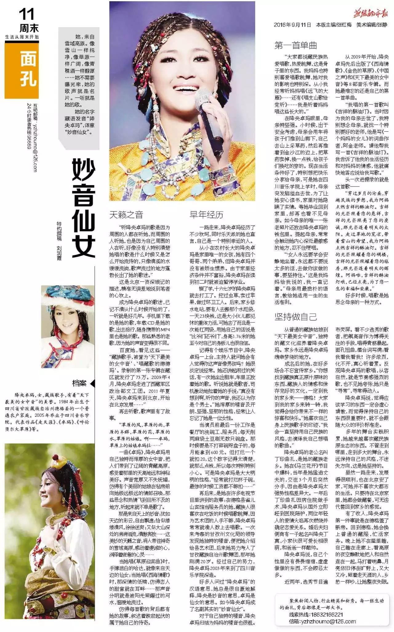 她,来自雪域高原。像雪山一样纯净,像草原一样广阔,像青稞酒一样醇厚……她不需要曝光率,她的歌声就是名片。一听就是她的歌。她的名字藏语发音“降央卓玛”,译意“妙音仙女”。