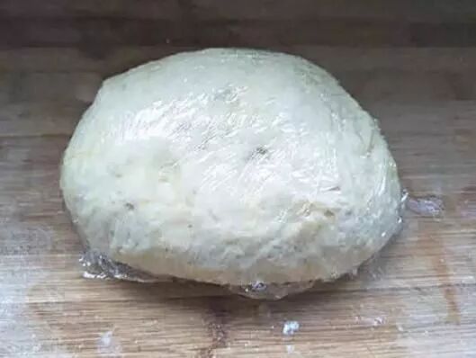 第三步,醒面!搅拌好的牛奶倒入面粉搅拌,用力揉几下形成面团,抹上油用保鲜膜包住,20分钟后直接按成长条状包保鲜膜再等20分钟