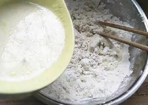 第二步,牛奶倒入碗中,加上鸡蛋更香,放入泡打粉和酵母,最后放入盐,半勺油,一定要记得搅拌均匀