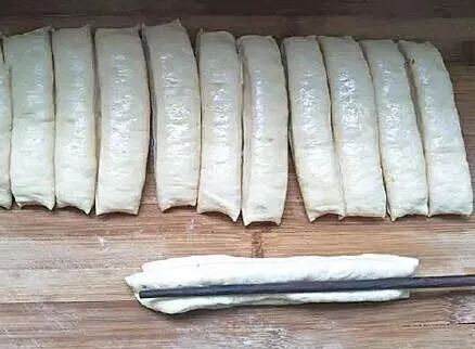 第四步,用刀切成小长条,每次取两根叠放,用筷子放中间按一下