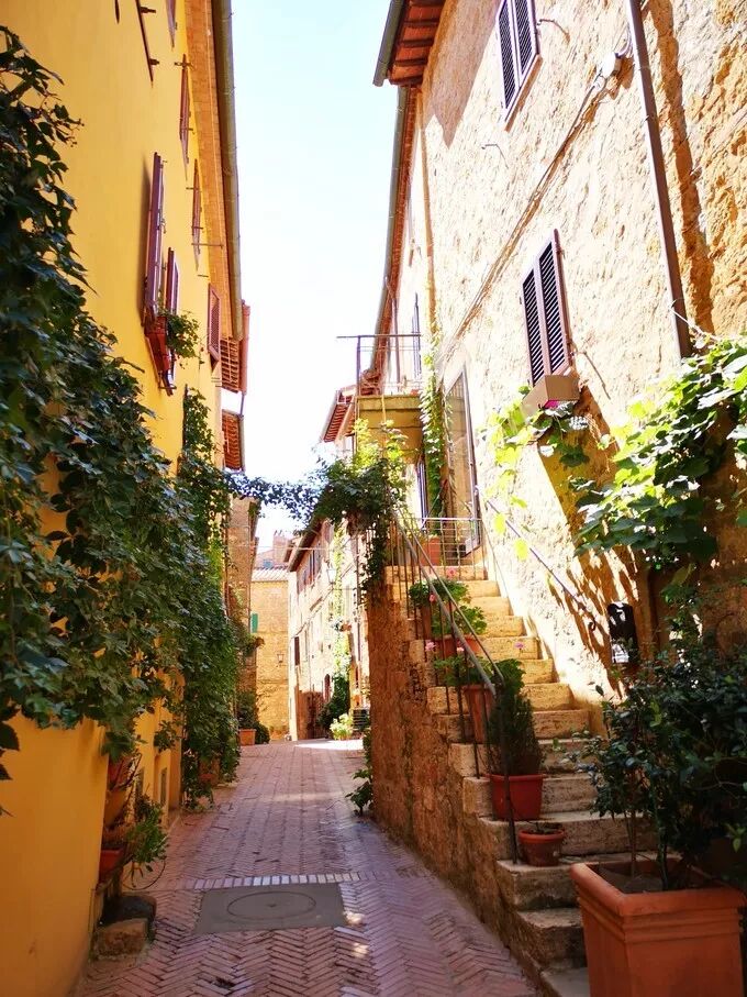 小镇里有三条巷子,分别被称为「爱情」「亲吻」「黑暗」,穿越巷子就能看见观景台,俯瞰托斯卡纳的无尽田野。