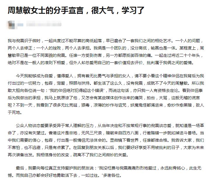 还敢说明星没才华?学习一下玉女掌门人优秀的分手宣言吧!一句没提小三,却句句都是秒杀的节奏!不仅文辞优美,更是情真意切。在娱乐圈混啊,优雅和涵养太重要了……难怪是师太亦舒看上的侄媳妇,太优秀!